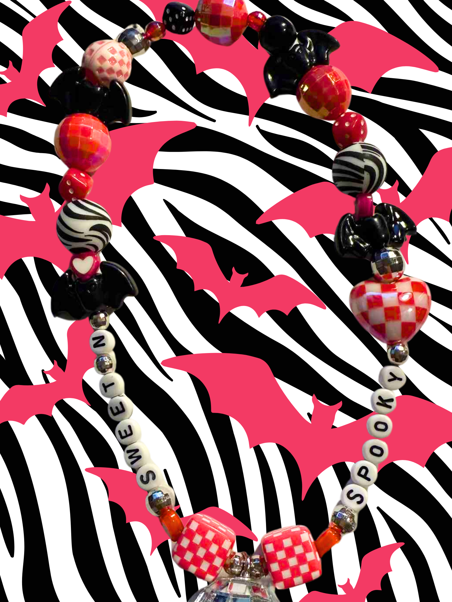 Sweet n spooky rearview mirror charm, paired with hearts, dice, disco balls, checkered beads, bats and animal print beads! Sparkle up your car with this whimsical, out of this world rearview mirror charm! This cute and trendy accessory is bound to add a fun touch to your car.