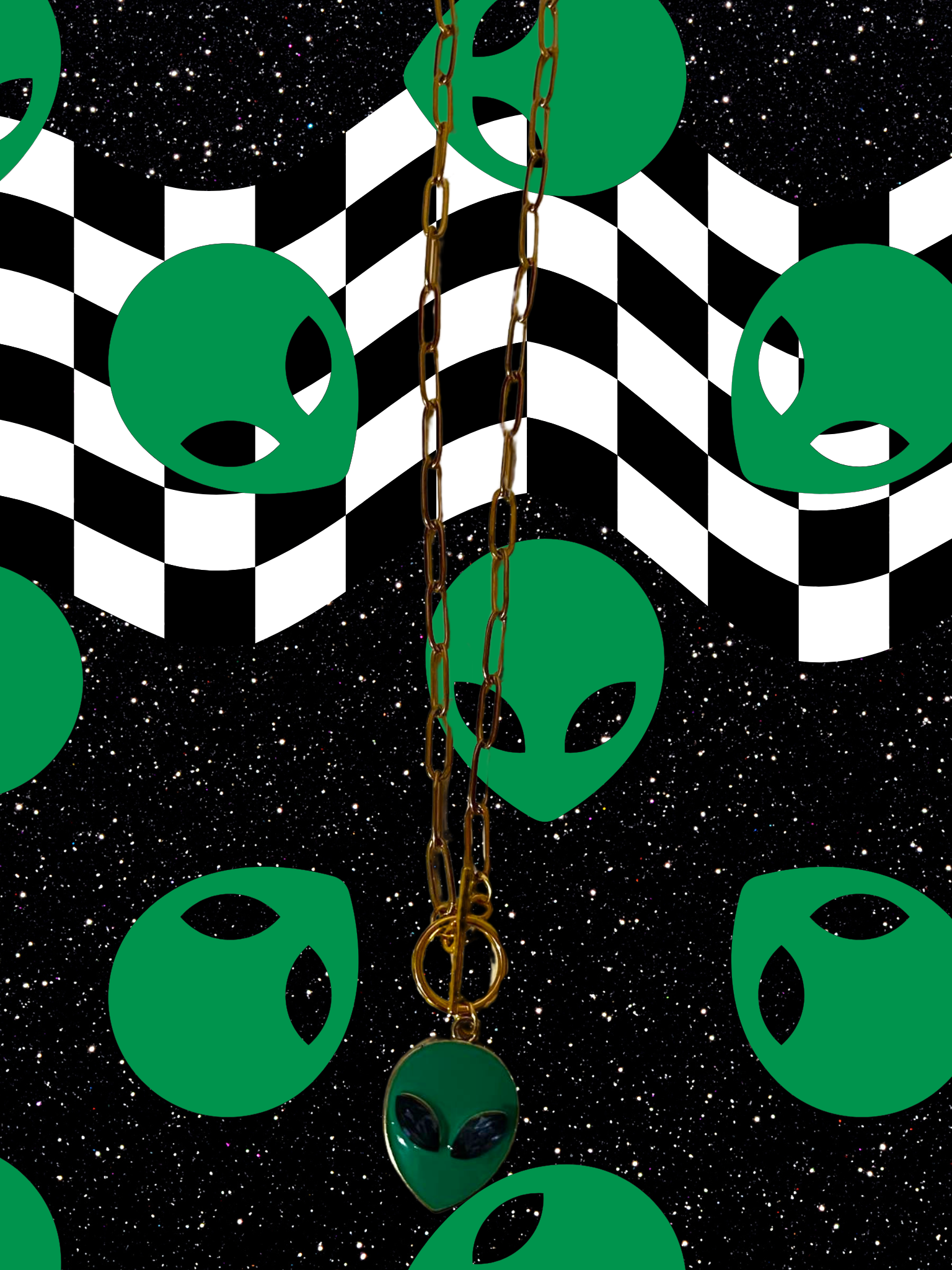 Take me to your leader charm necklace, gold stainless steel paperclip chain, 14 inches in length, toggle clasp, charms included in this statement necklace are an alien head charm with diamond blue eyes. Show out your everyday accessories with this unapologetic statement piece. Sure to bring a cool, bold, and groovy vibe to your everyday clothing wear!Ā