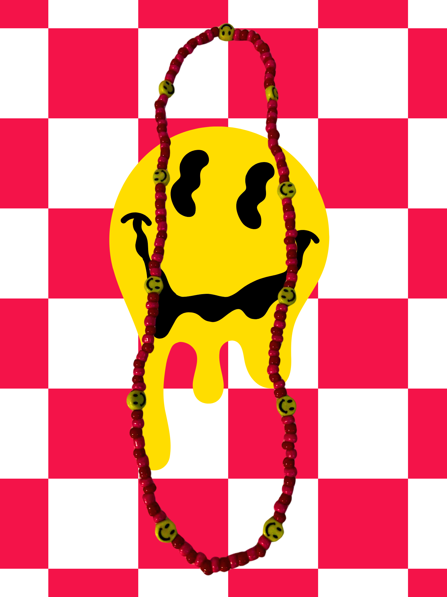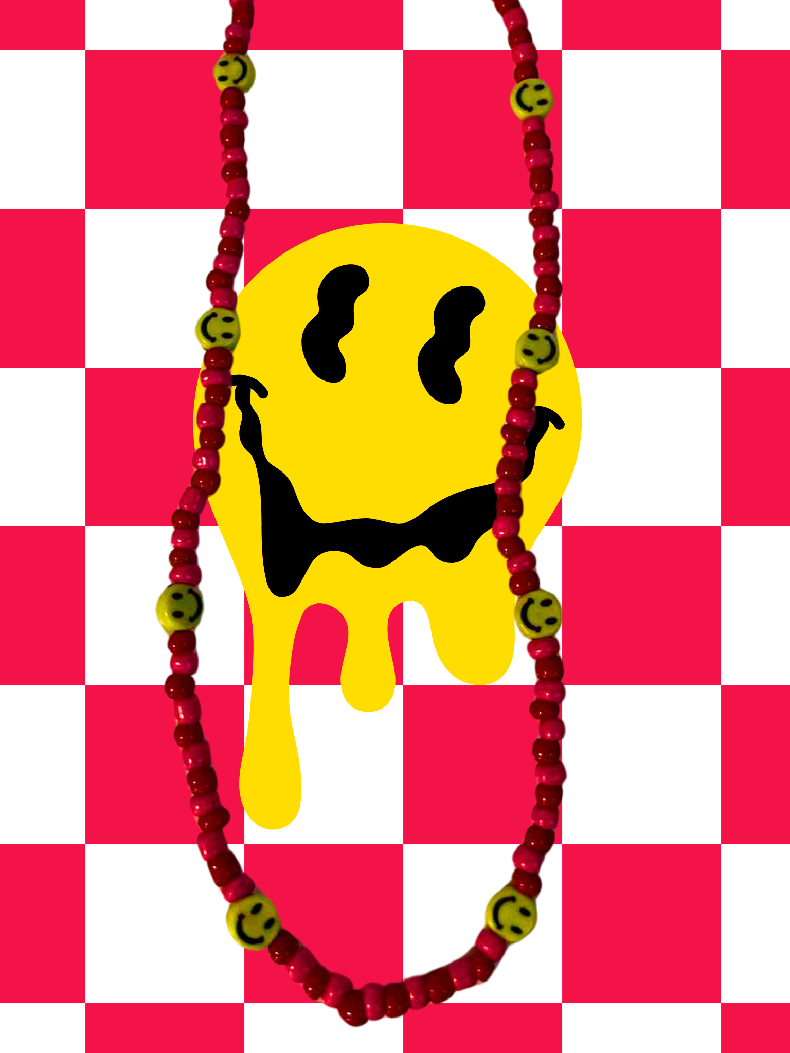 That's hot beaded necklace, threaded with hot pink and red beads and the added yellow smiley face beads! Sparkle up your everyday accessories with this fun statement piece. Sure to bring a funky, colorful, fun vibe to your everyday clothing wear! Threaded with stretchy elastic string, length is 16 inches.