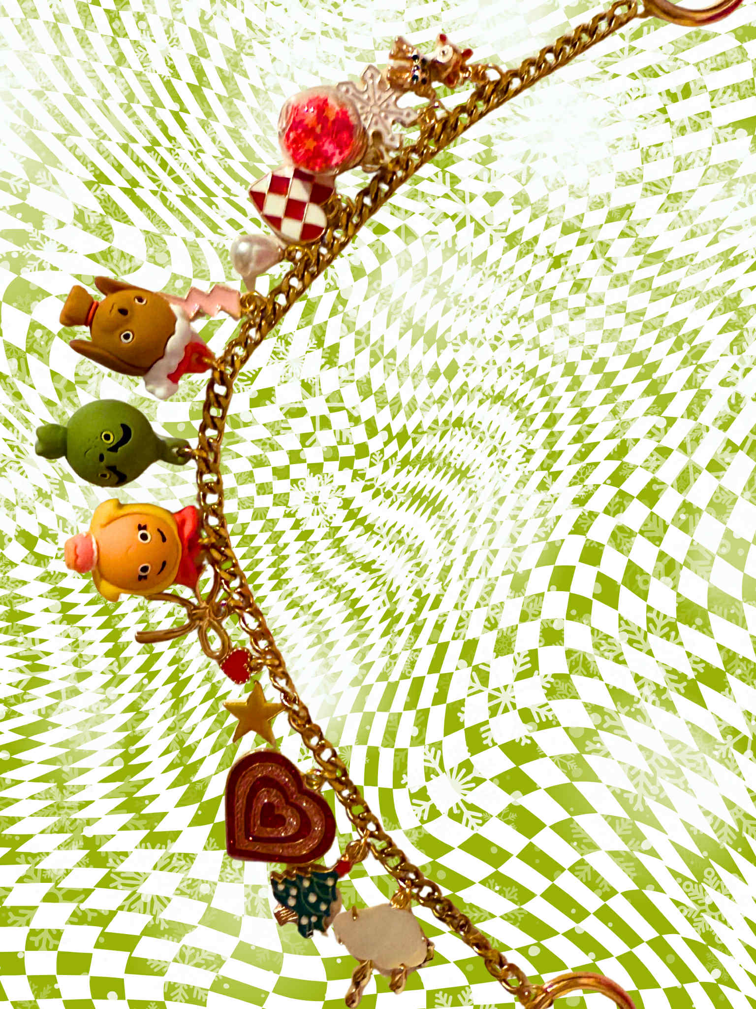 The Grinch purse charm, gold stainless steel chain, 12 inches in length, there are many charms included along the chain to match and make your character/s standout. Added charms have been soldered to ensure hold on chain. Show out your everyday accessories with this unapologetic statement piece. Sure to bring a cool, bold, and groovy vibe to your everyday clothing wear!