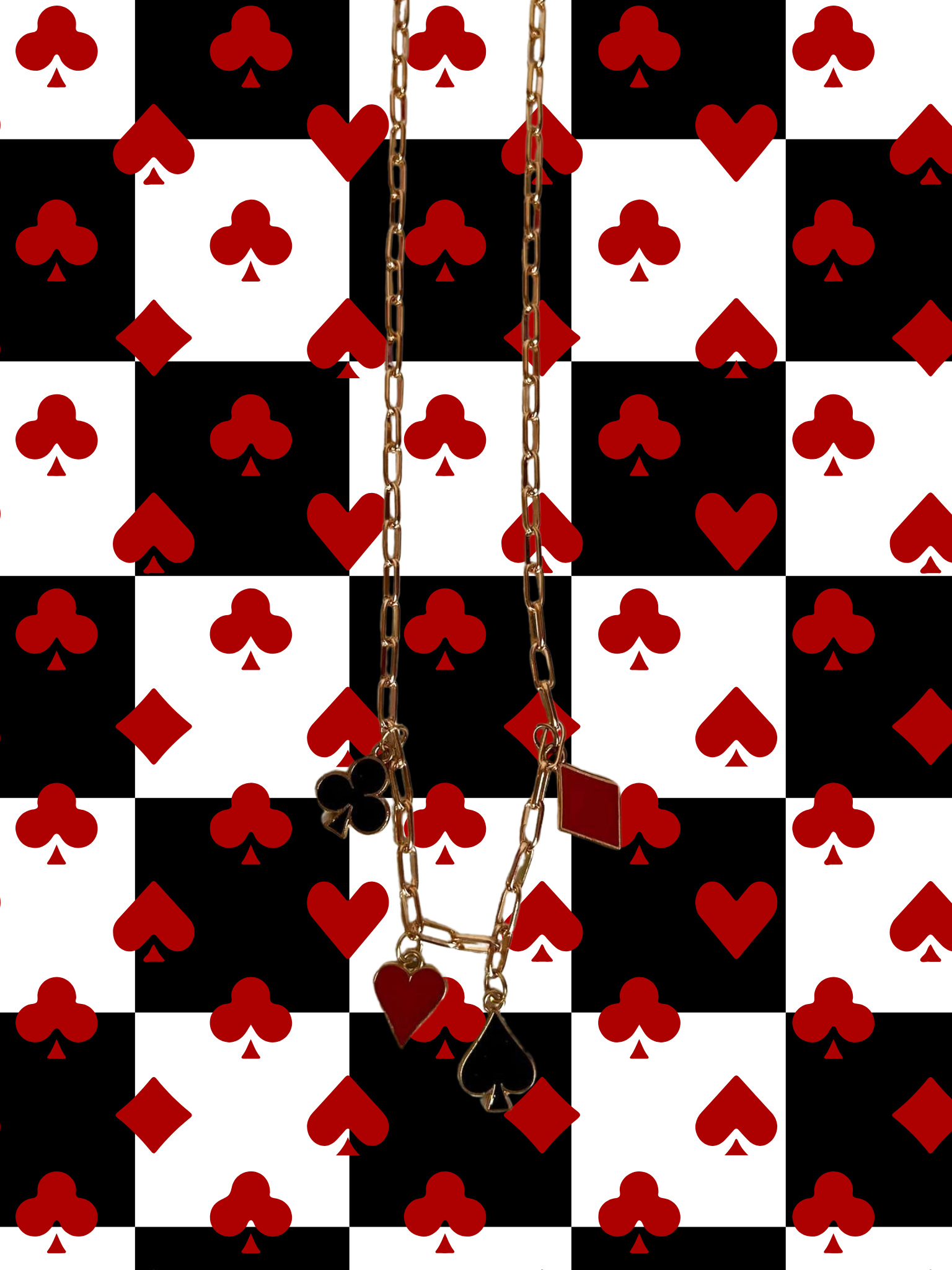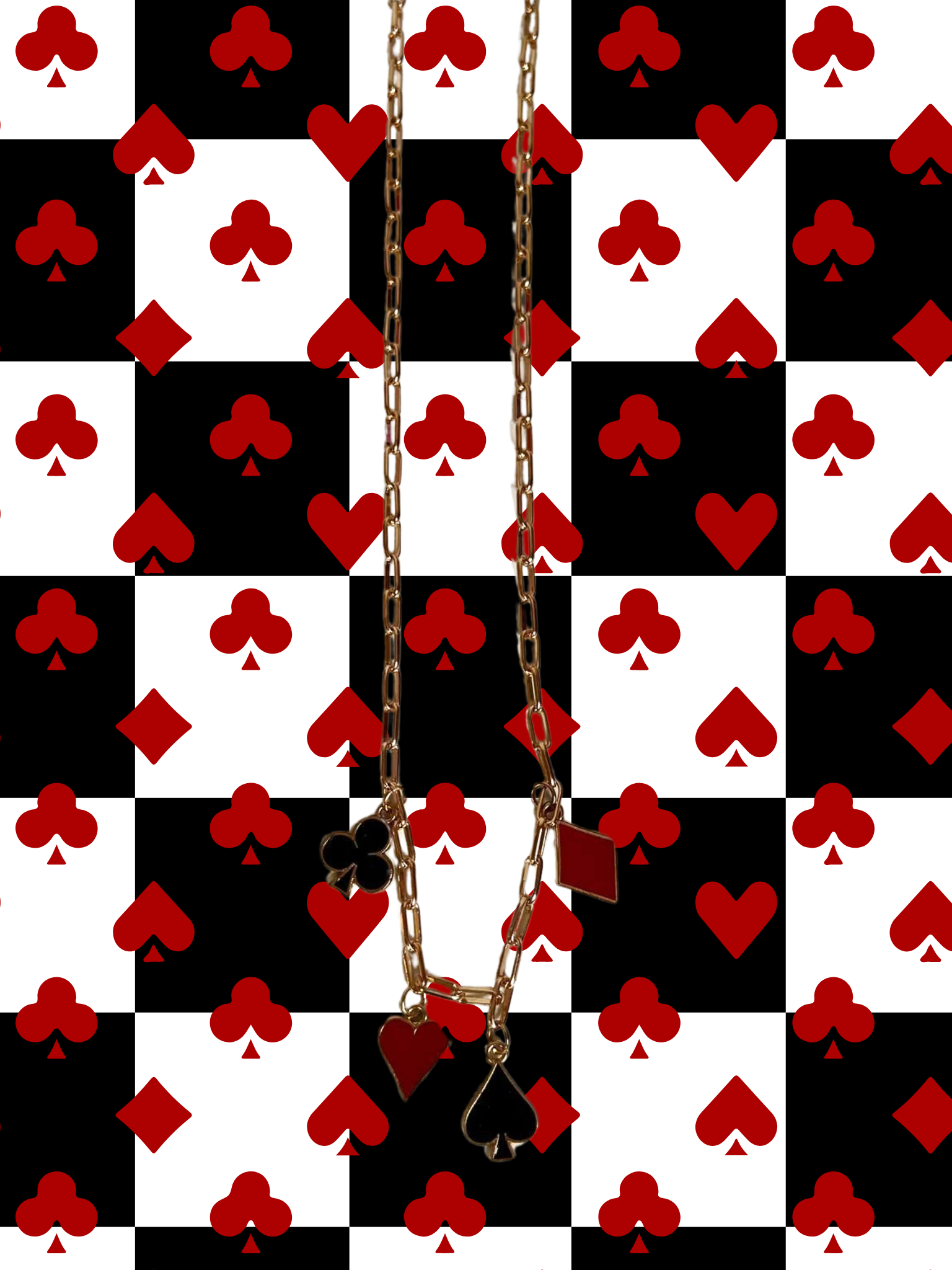 Try your luck charm necklace, gold stainless steel paperclip chain, 17 inches in length, tail chain added for extra comfort fit, charms included in this statement necklace are a clubs card symbol, hearts card symbol, spades card symbol and a diamonds card symbol. Show out your everyday accessories with this unapologetic statement piece. Sure to bring a cool, bold, and groovy vibe to your everyday clothing wear!Ā