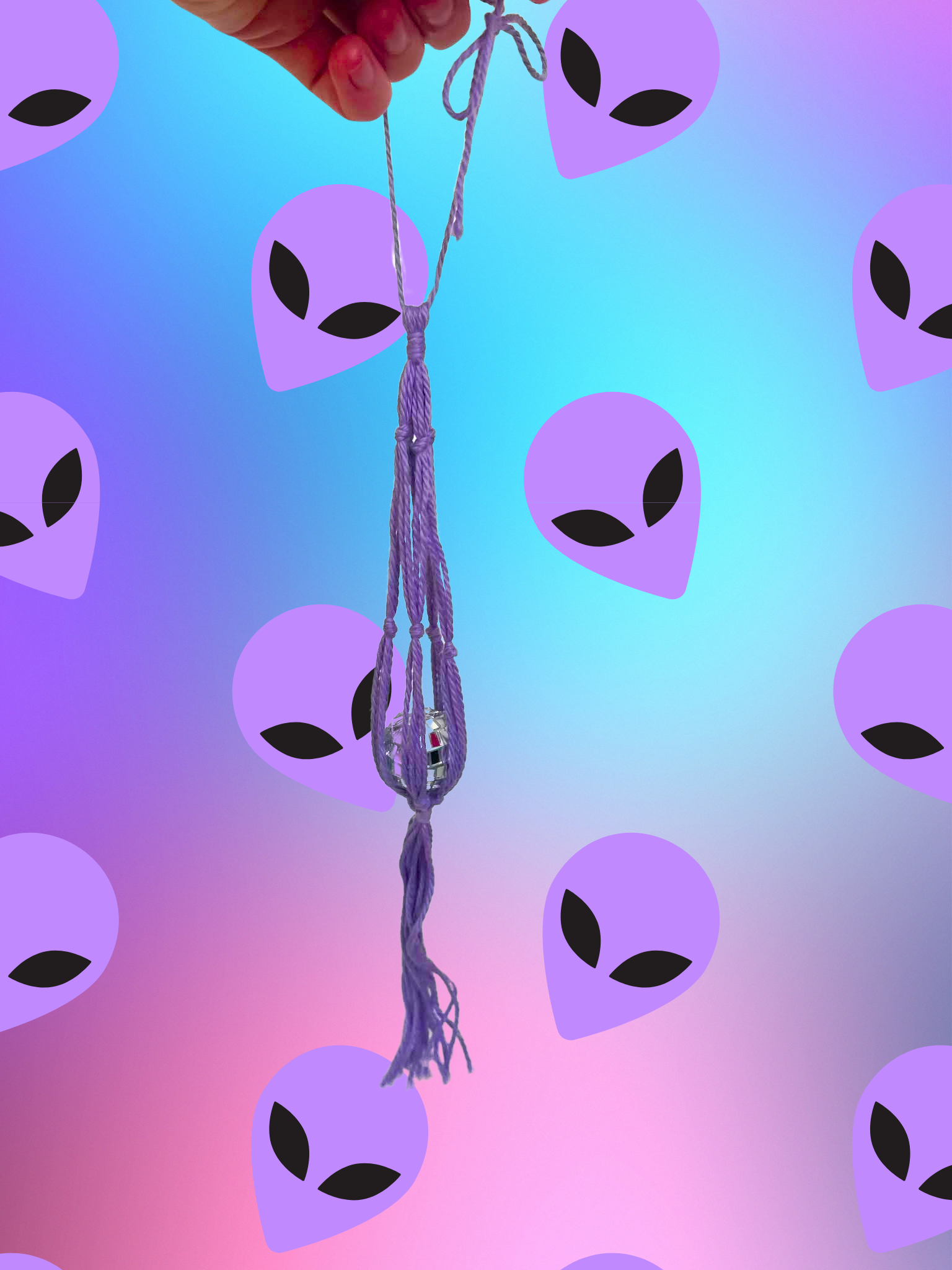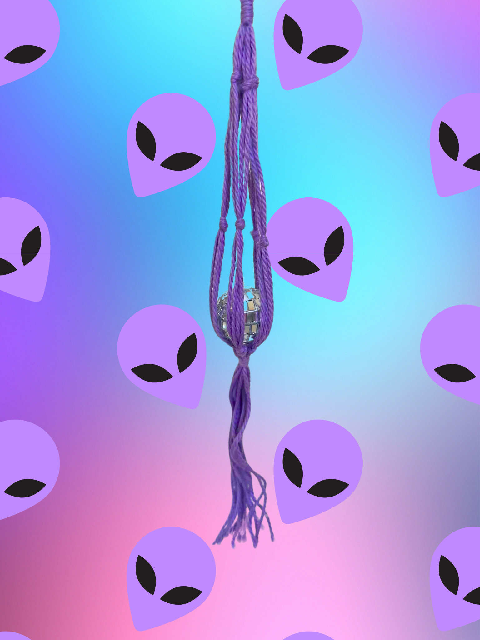 Weird dayz macrame rearview mirror charm, braided with purple colored rope, and the added touch disco ball! Sparkle up your car with this whimsical, out of this world rearview mirror charm! This cute and trendy accessory is bound to add a fun touch to your car.