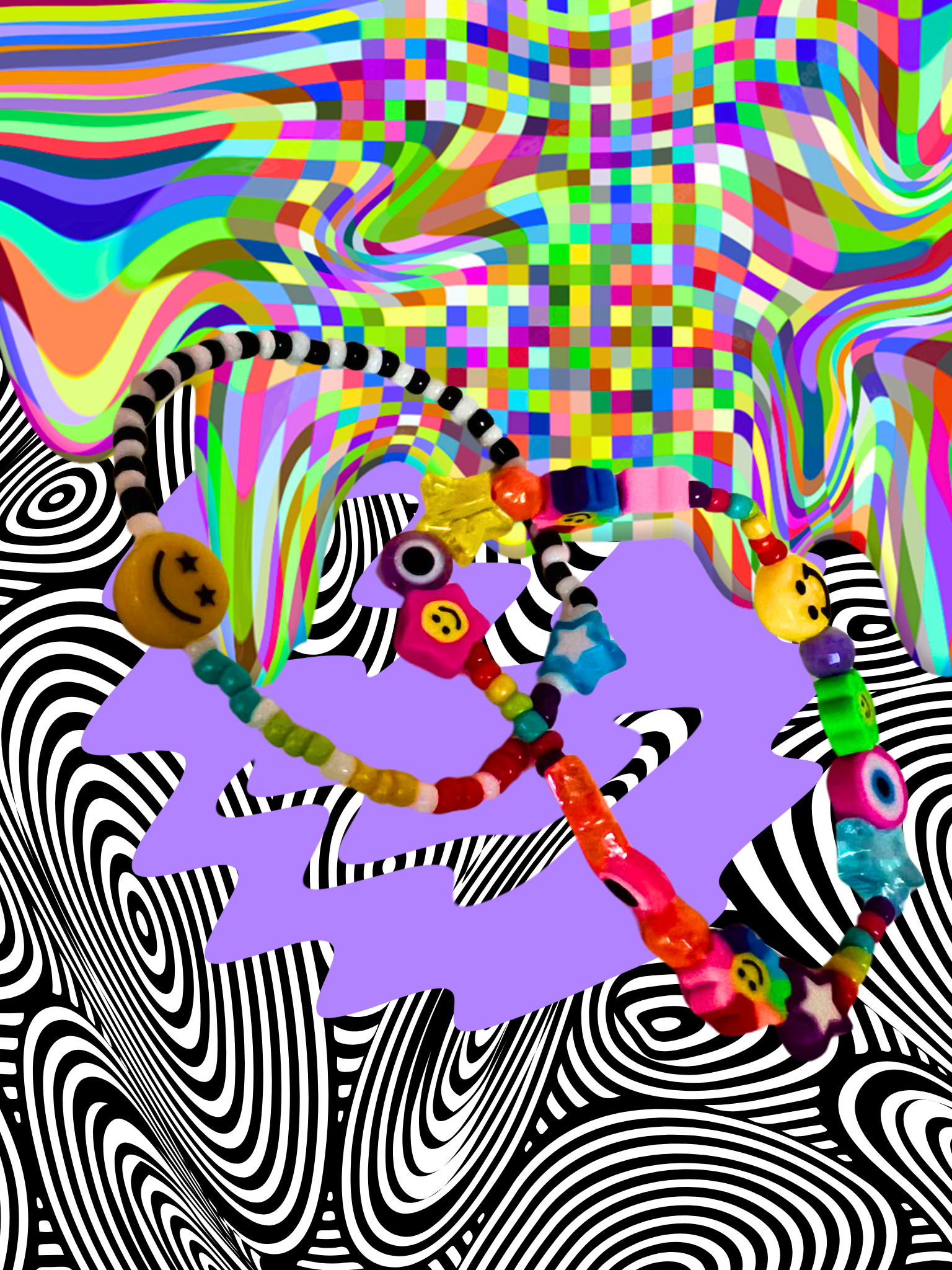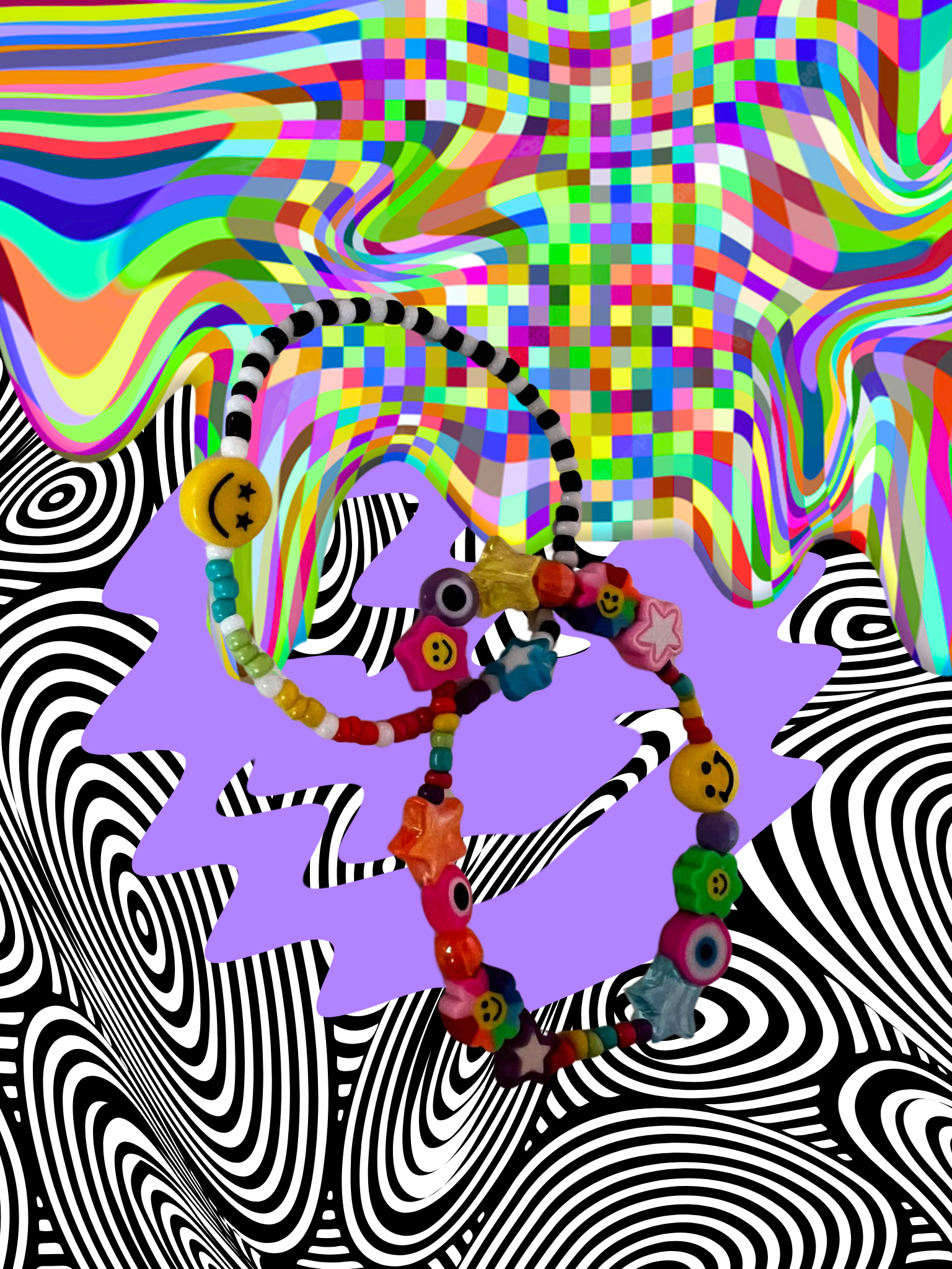 Weirdos unite beaded bracelet set, threaded with the color of the rainbow, black and white beads, star smiley faces, disco balls, stars, evil eyes, and flowers! Sparkle up your everyday accessories with this fun statement piece. Sure to bring a funky, colorful, cool vibe to your everyday style wear! Threaded with stretchy elastic string, length is 6 inches.