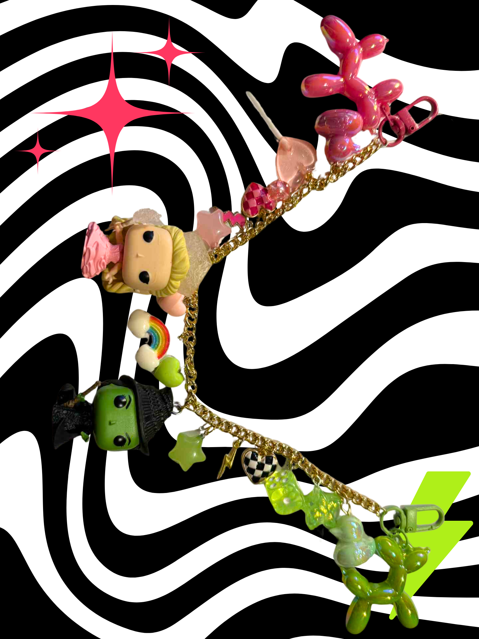 Wicked purse charm, gold stainless steel chain, 13 inches in length, there are many charms included along the chain to match and make your character/s standout. Added charms have been soldered to ensure hold on chain. Show out your everyday accessories with this unapologetic statement piece. Sure to bring a cool, bold, and groovy vibe to your everyday clothing wear!